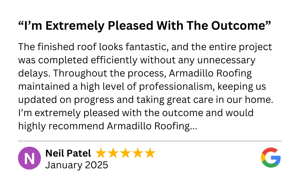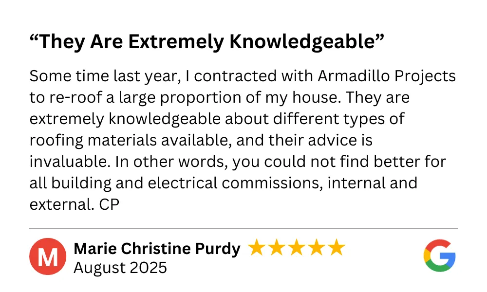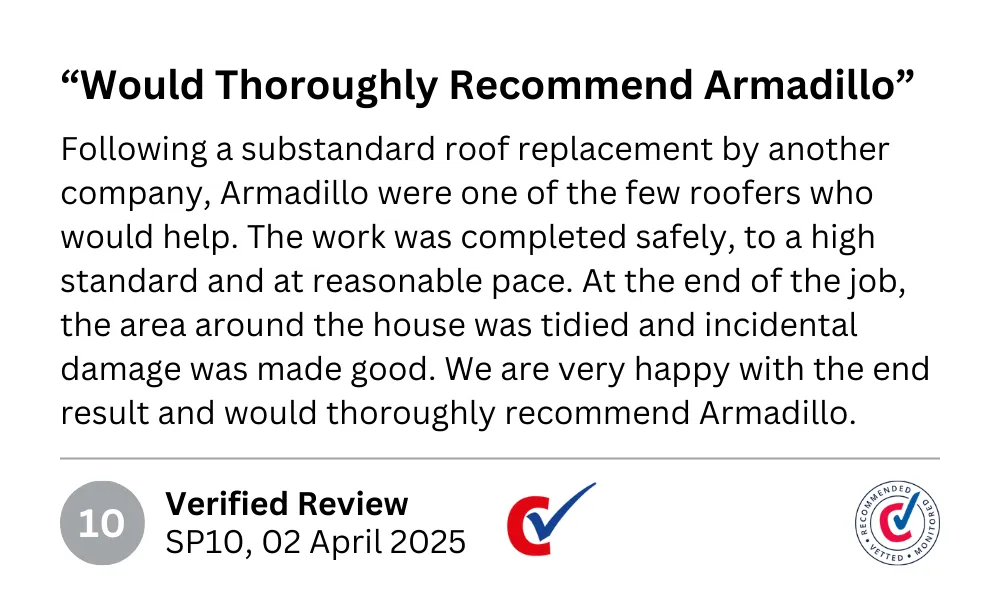 Today, with over 600 roofs completed under the Armadillo Roofing Ltd brand, we're proud to say most of our work comes from word of mouth and happy customers. If we wouldn't accept it on our own homes, it doesn't go on yours."